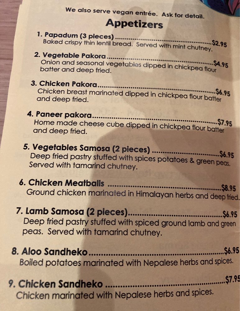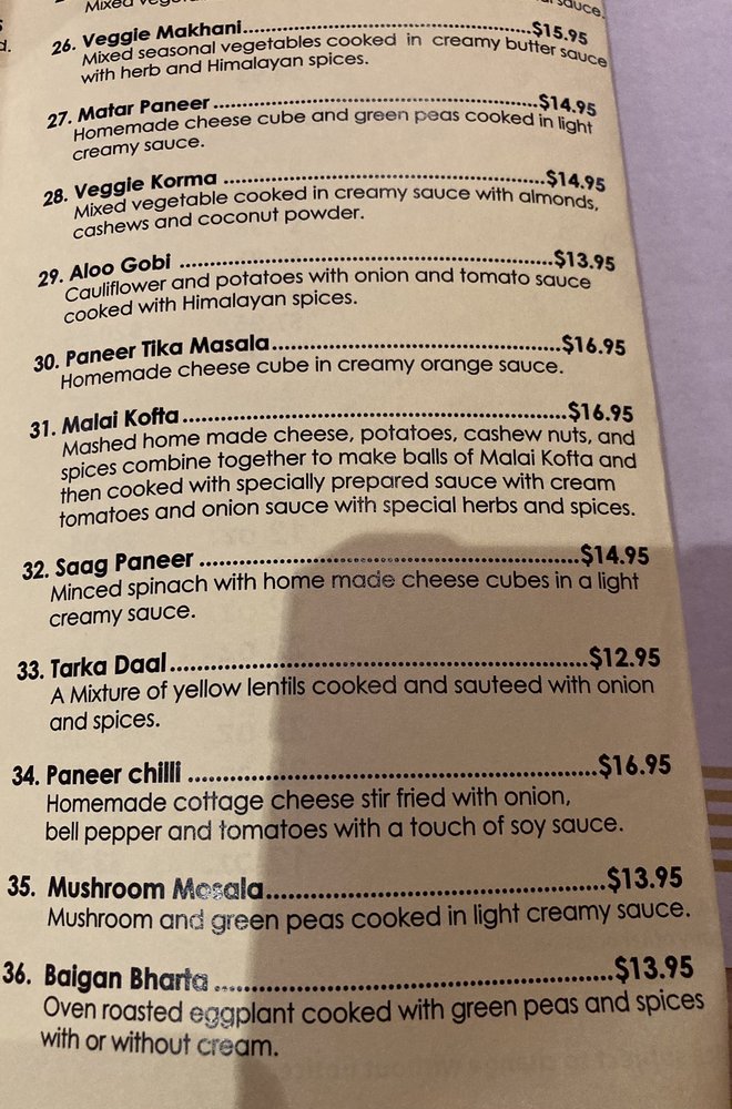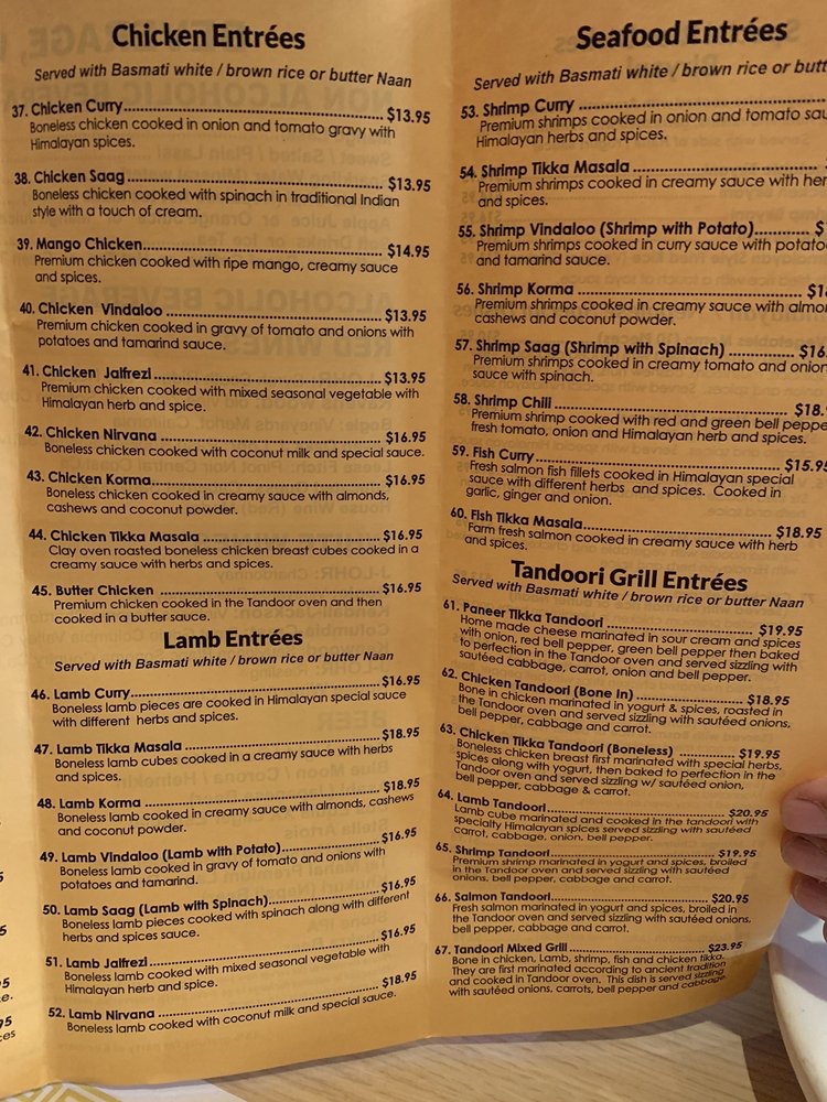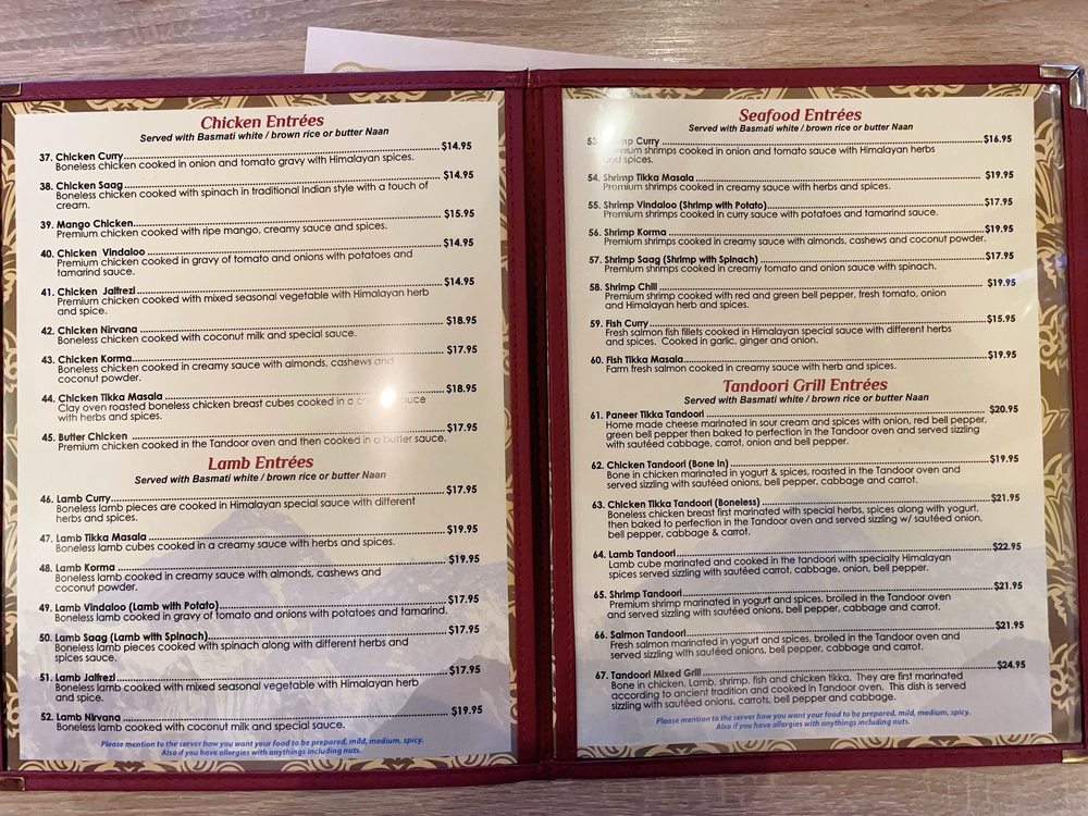 The seafood entrees shine brightly, featuring favorites like Shrimp Curry and Shrimp Tikka Masala, both infused with aromatic Himalayan herbs and spices. Don't miss the Shrimp Korma or the unique Shrimp Vindaloo, ideal for those seeking a touch of heat. For rice lovers, the biryani selections, such as Chicken Biryani and Lamb Biryani, provide a fragrant and hearty experience.